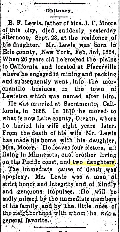 His daughter, Elvira, married James Moore in 1883, in Linkville, Oregon (now Klamath Falls), just